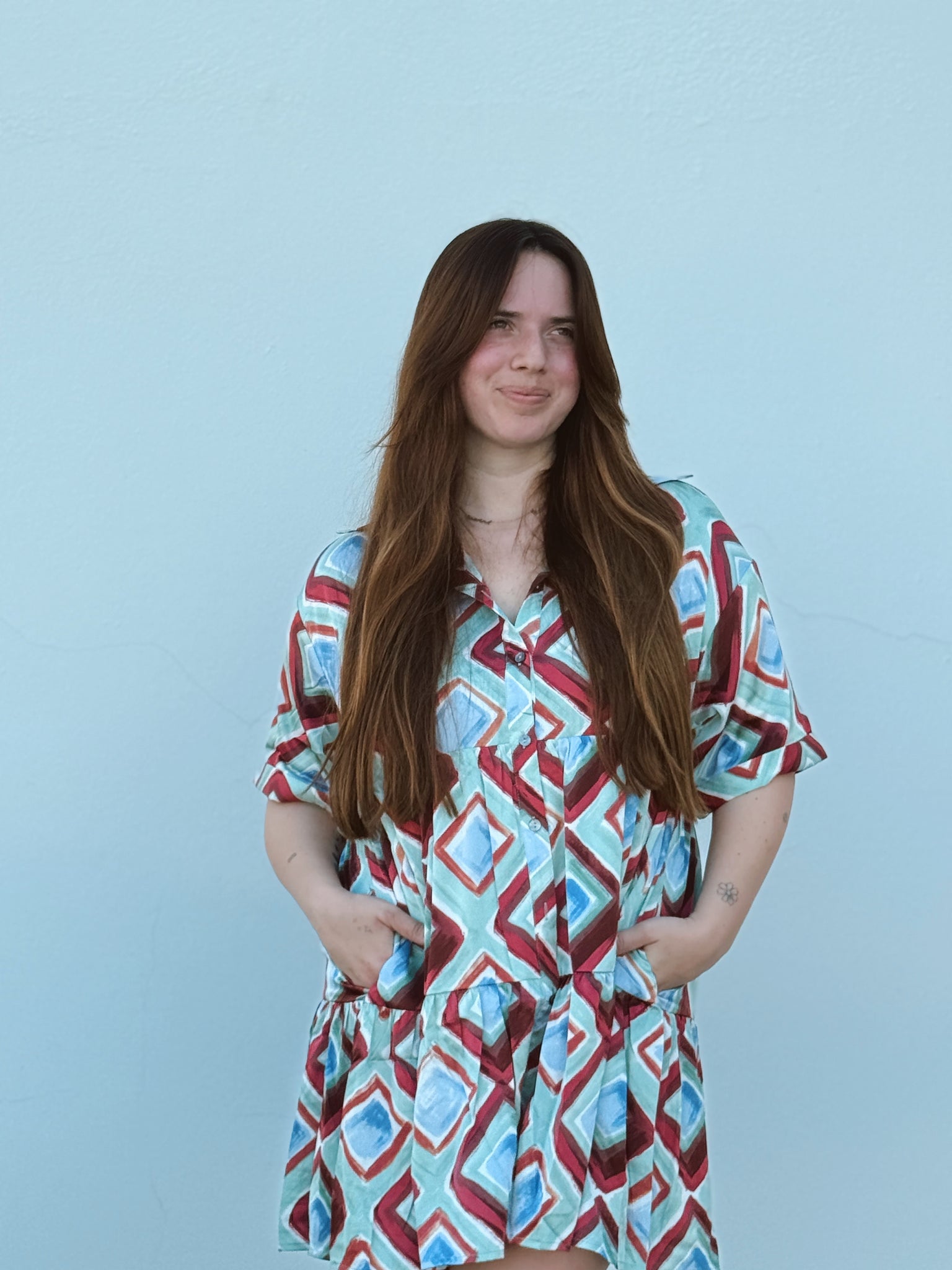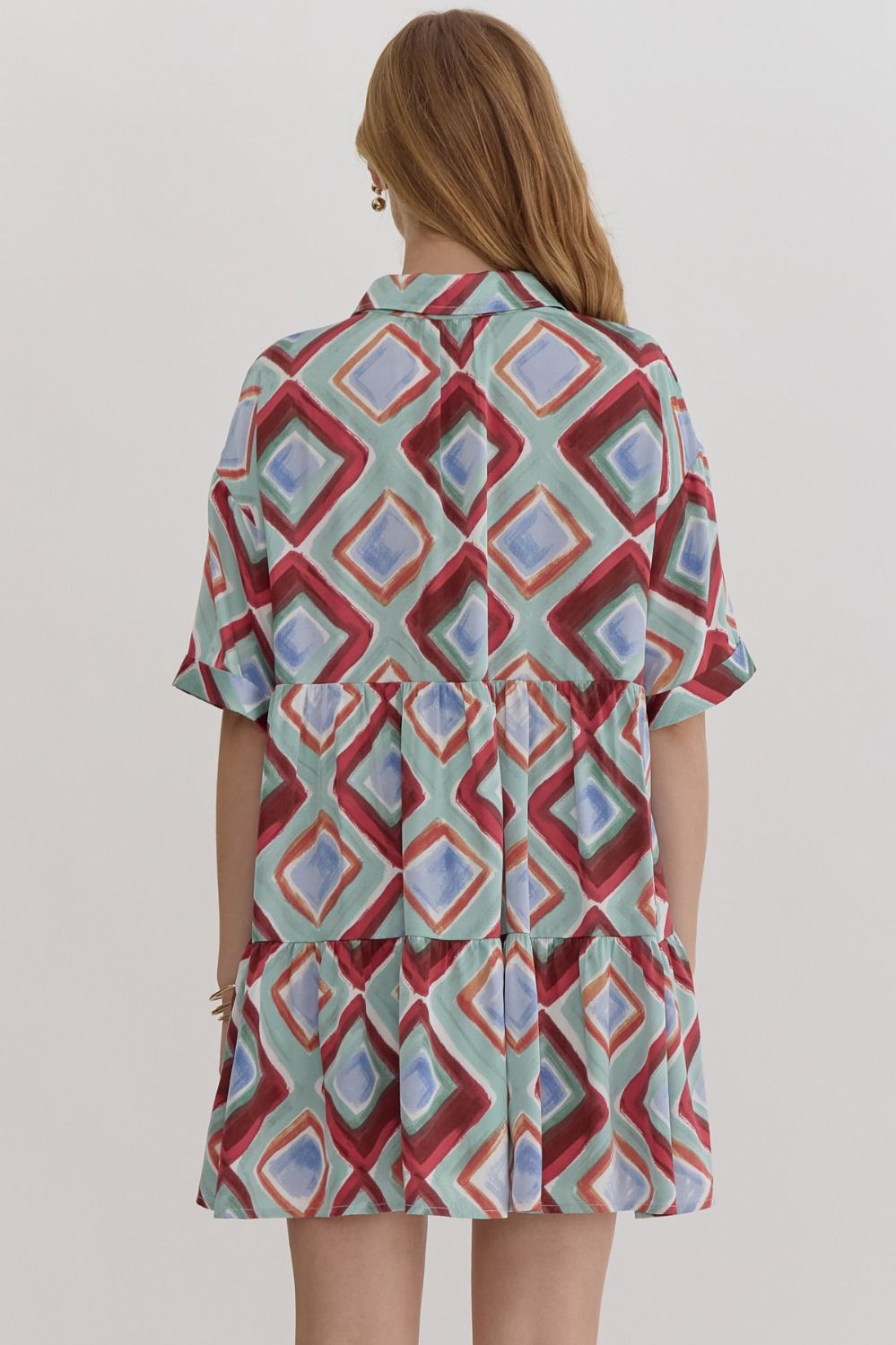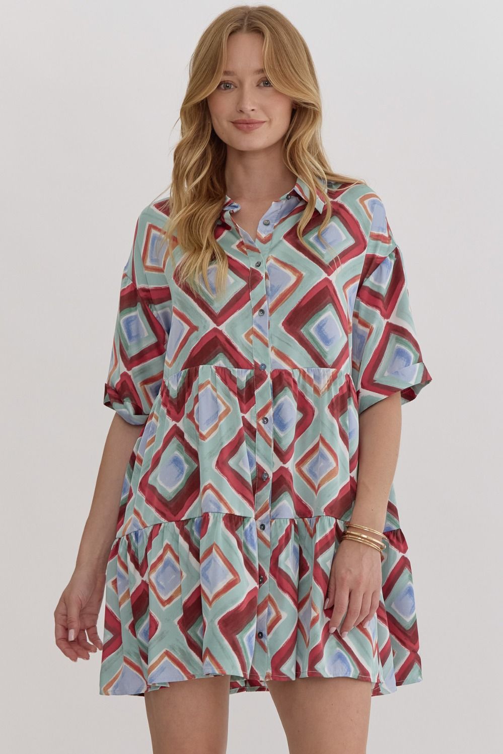 Printed tiered button up dress featuring permanent rolled cuffs. Pockets at side. Lined. Woven. Non-sheer. Lightweight.