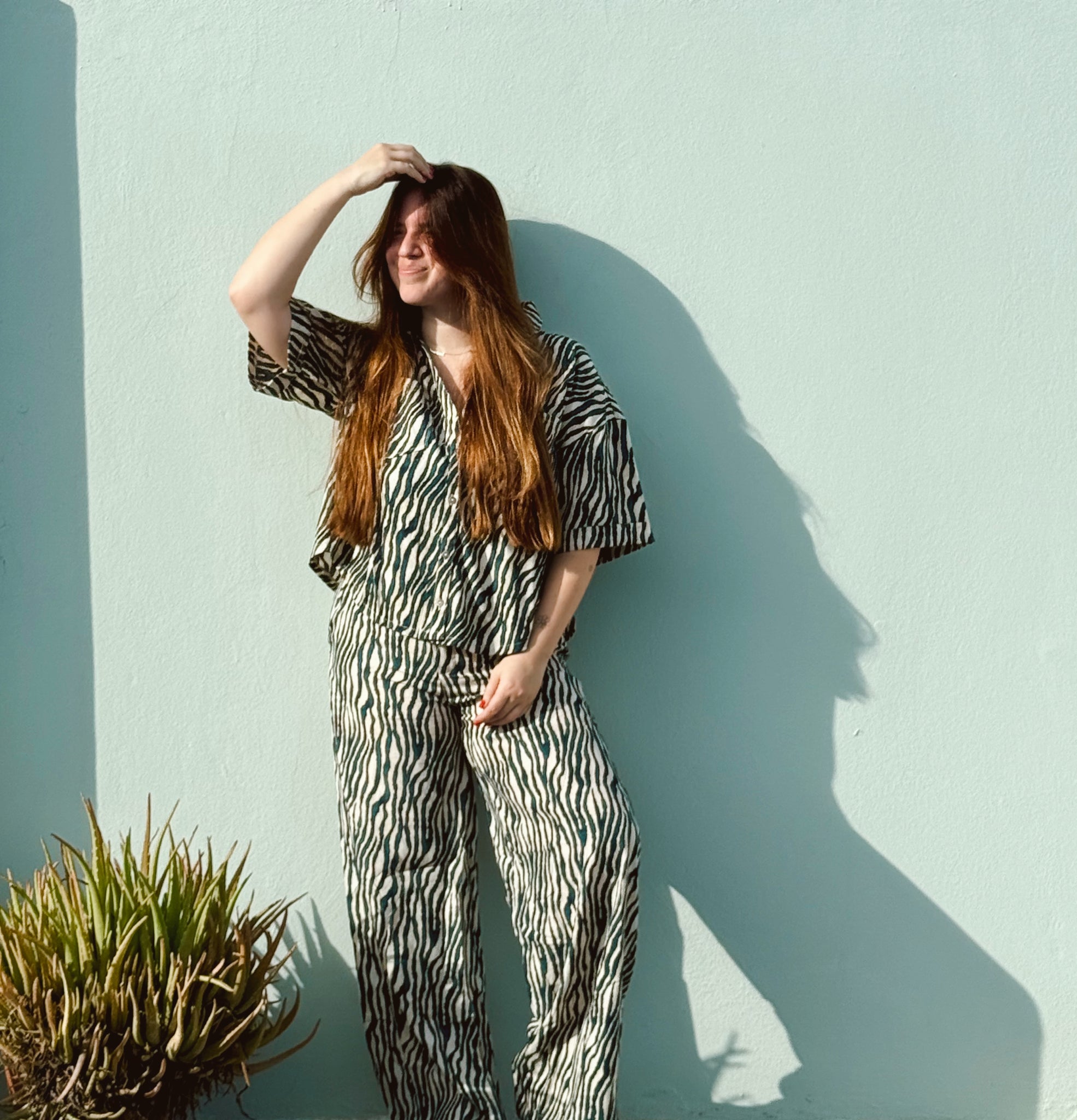 Print short sleeve top featuring front button closure and chest pockets. Unlined. Woven. Non-sheer. Lightweight.