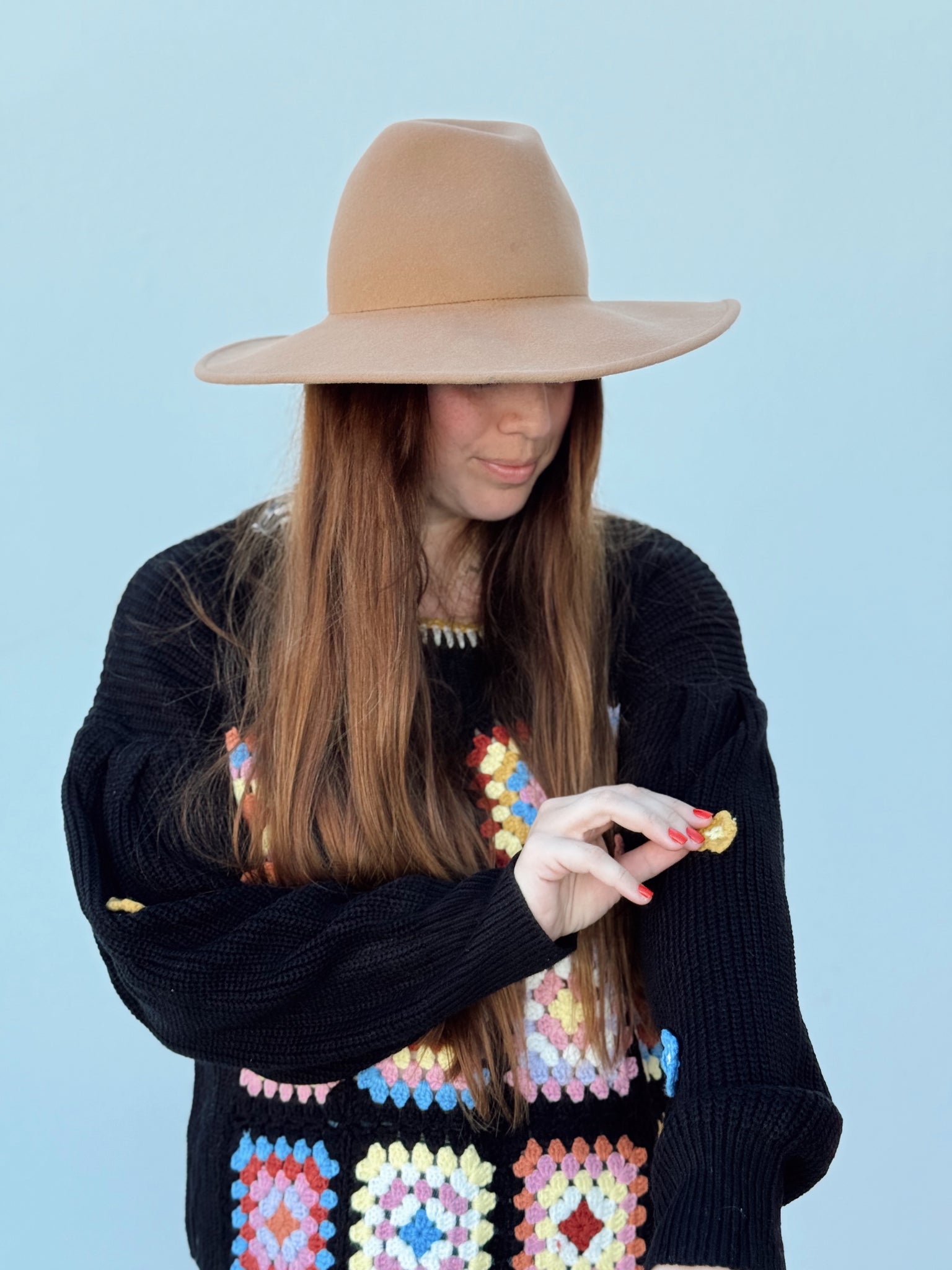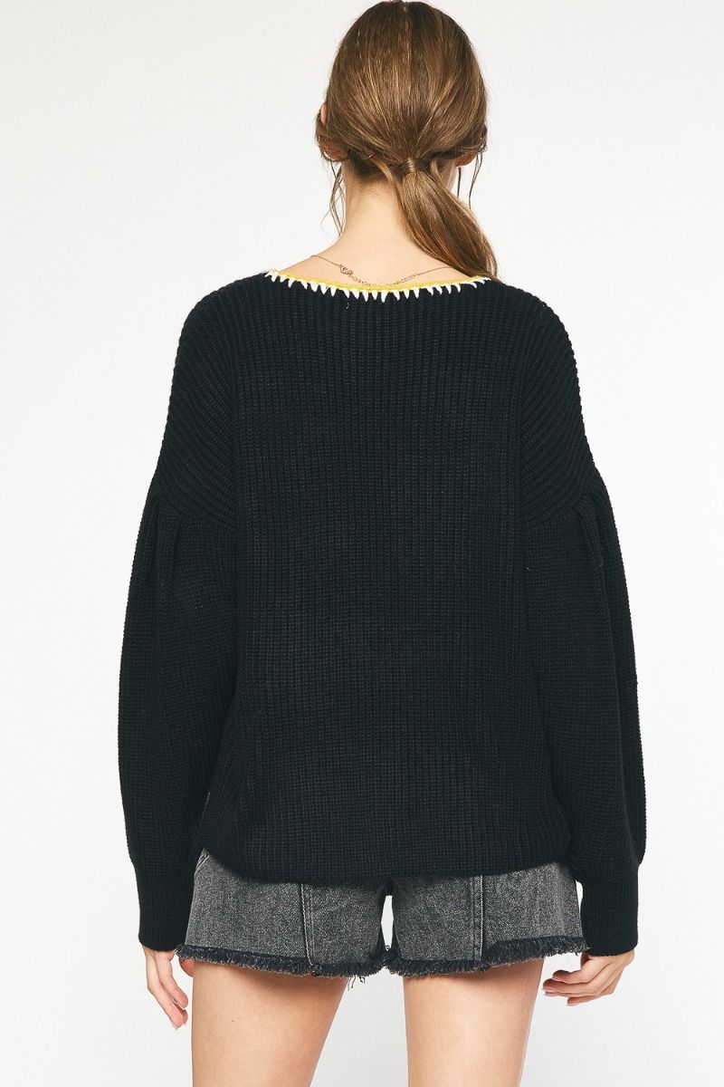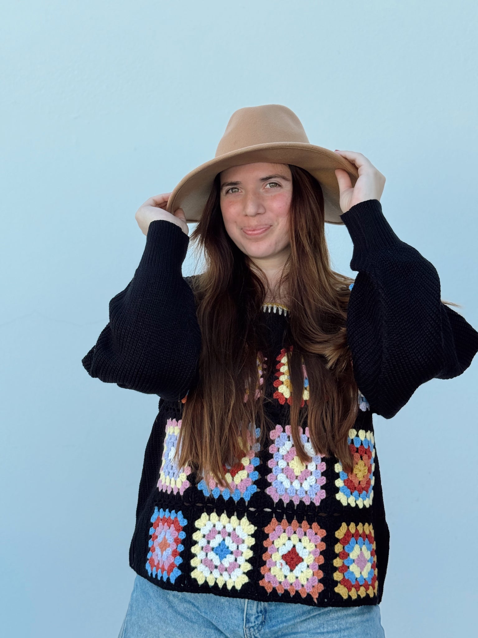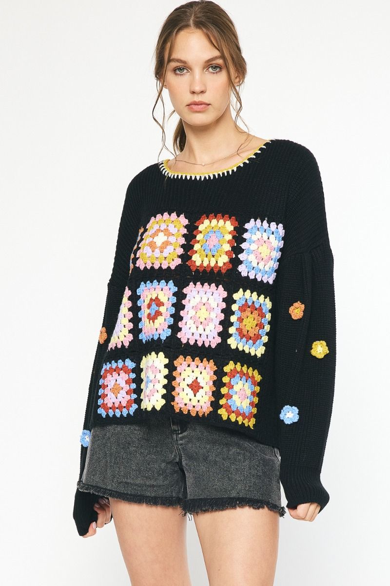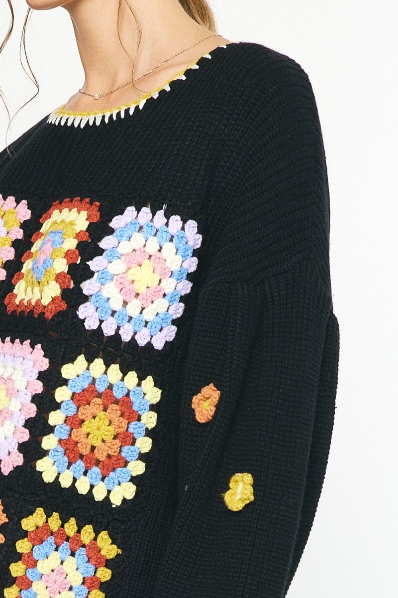 Solid long sleeve knitted sweater featuring crochet patchwork detail at front. Unlined. Knit. Non-sheer. Mediumweight.